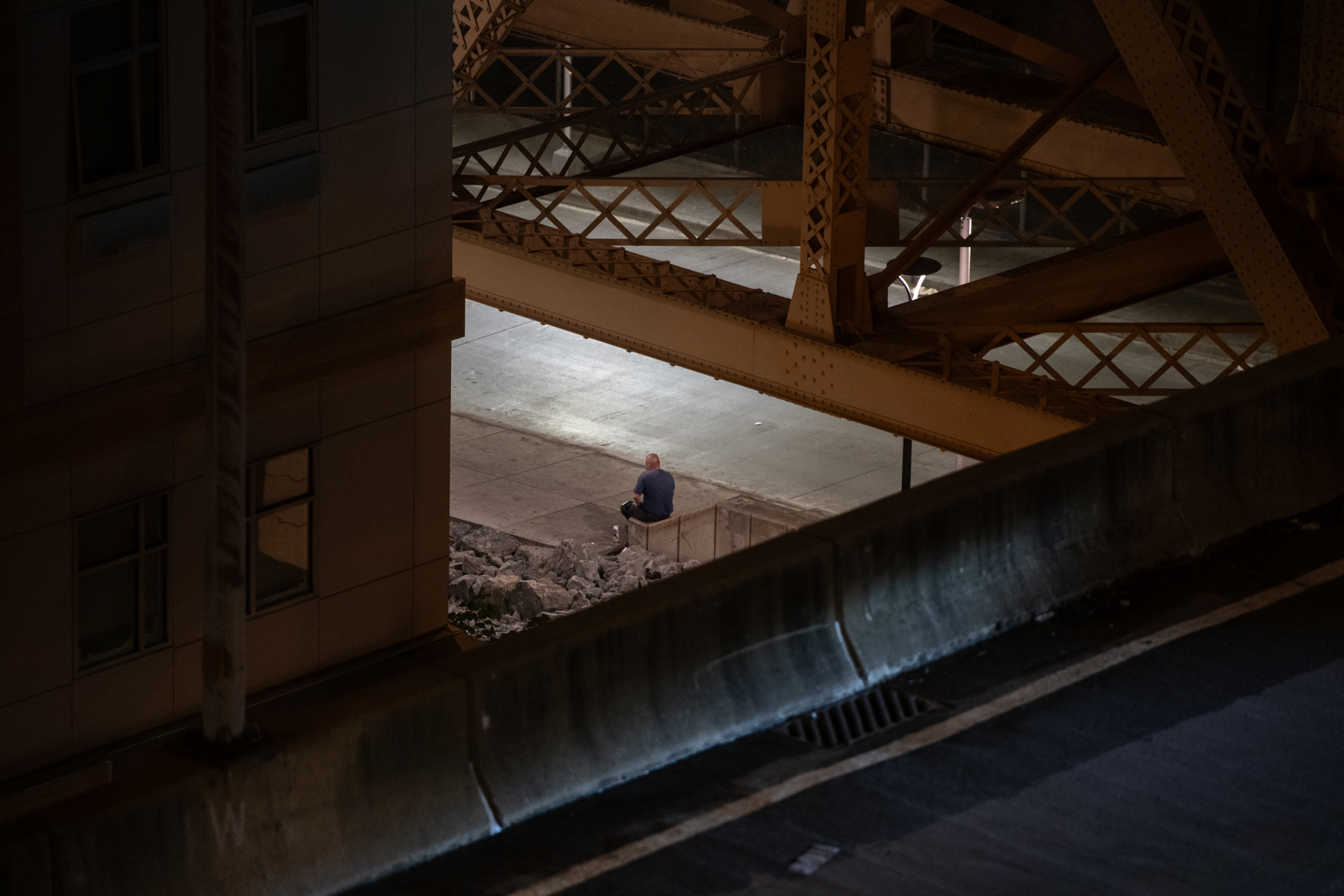 A person sits alone beside Second Avenue Commons as framed by the surrounding bridge and highway, on Sept. 8, 2023, in Uptown. The facility includes beds for people experiencing homelessness. (Photo by Stephanie Strasburg/Pittsburgh’s Public Source)
