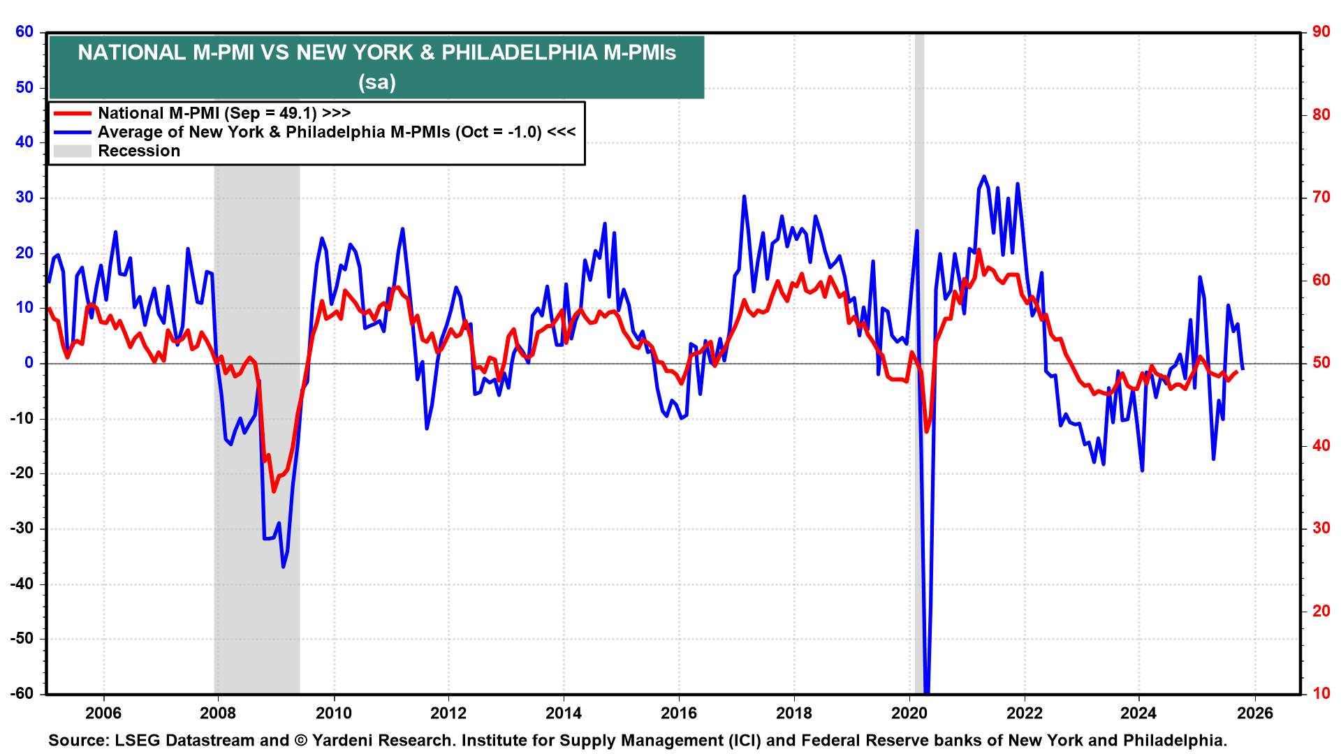 (3) Fed business surveys. In August, the Chicago Fed’s national activity index posted its best performance in five months, coming in at -0.12. Its September survey (Thu) will be released the same day as the Kansas City Fed’s read on its regional business activity, which showed a modest decline in September. The average of September’s New York and Philadelphia Fed district surveys remained weak (chart).