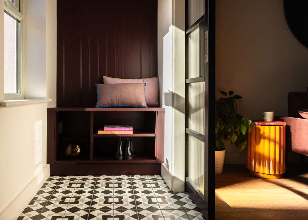 To give the couple a sense of privacy from passersby, she introduced a tiled hall to the floor plan, where a bespoke bench was built to hang coats and keep outdoor shoes.