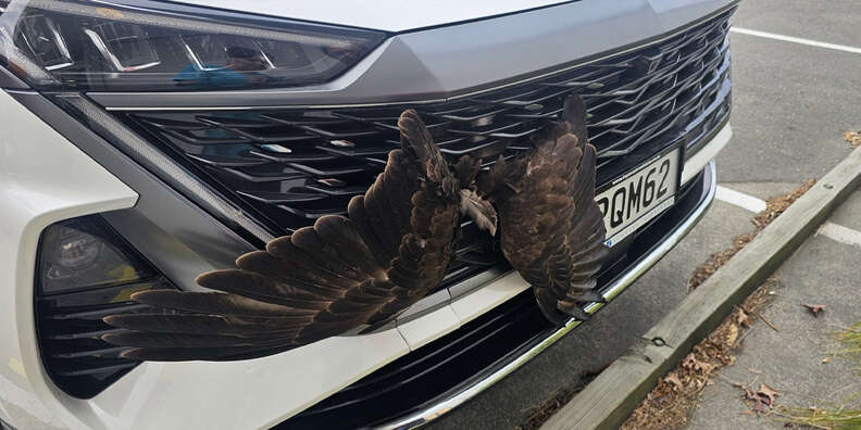 Last week, as a woman was test-driving a car in New Zealand, the unthinkable happened. She’d accidentally struck a low-flying hawk, who then became stuck to the front grille of the vehicle.