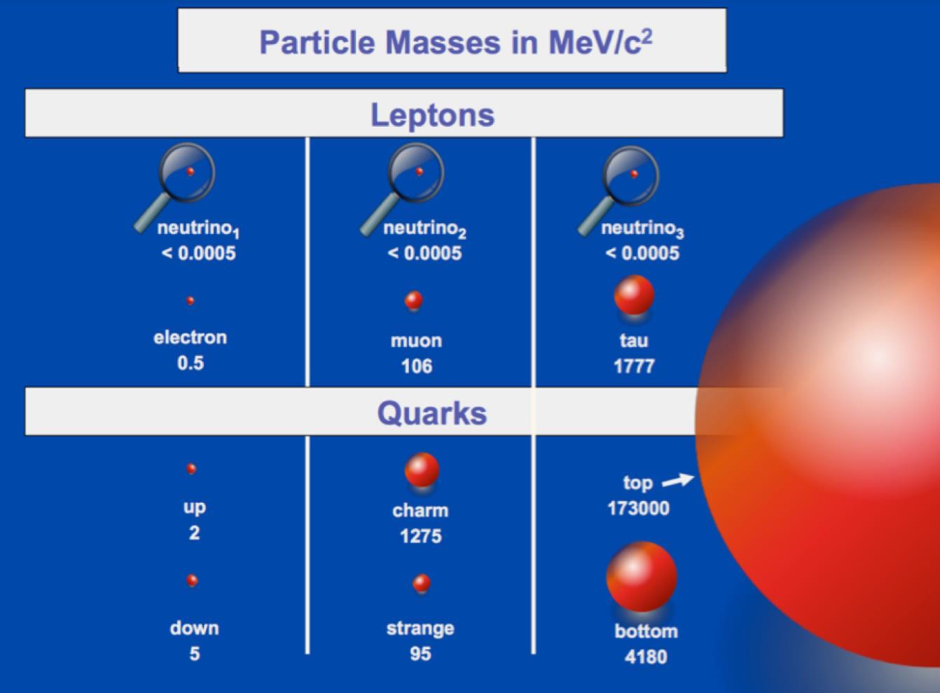 This to-scale diagram shows the relative masses of the quarks and leptons, with neutrinos being the lightest particles and the top quark being the heaviest. No explanation, within the Standard Model alone, can account for these mass values. We now know that neutrinos can be no more massive than 0.45 eV/c² apiece, meaning that the difference between a neutrino’s mass and an electron’s mass is more than three times as large as the difference between the electron’s mass and the top quark’s mass.