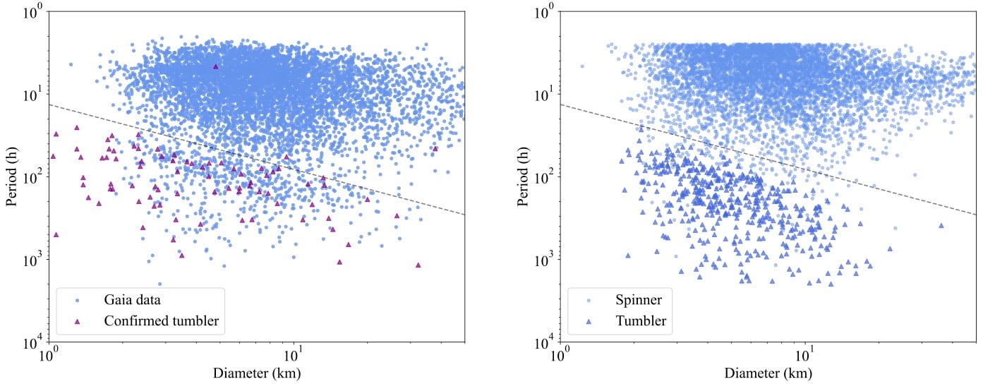 The key to the paper was the release of a new data set from Gaia, the galaxy mapping mission launched by ESA. As part of its third data release (DR3), it also captured data on thousands of asteroids. Some of these “tumble” by rotating around something other than their principal axis, but others do “spin” around their largest axis. Why some spin and some tumble wasn’t explained by current asteroid rotation models either. Neither was the overabundance of “slow rotators” whose rotational period was much slower than predicted in traditional models.