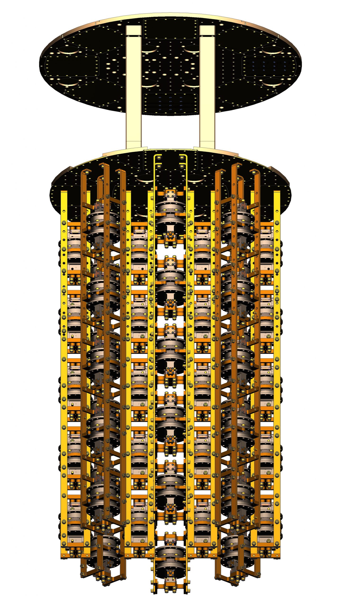 A rendering of the SQMS Center’s planned 100-plus-qudit SRF quantum processor, designed to demonstrate scalable, high-coherence quantum computation, communication and sensing within a single dilution refrigerator. Credit: SQMS Center