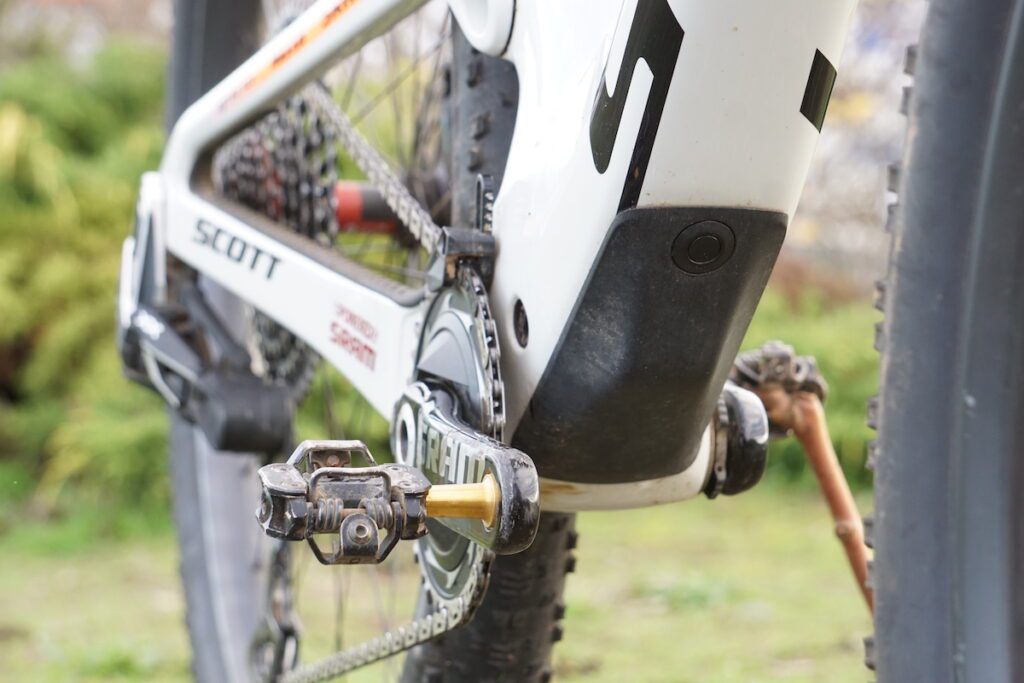 The Scott-SRAM-edition Johnston had at home was her training bike, only raced at one event. The race bike had a more purple frame and fancy green fork from RockShox. But the bikes are otherwise the same. Full RockShox Flight Attendant suspension, which automatically opens and locks out Johnston’s suspension based on sensors in the fork, shock and power meter data. The Spark RC hides the shock inside the frame,,  but it’s also electronically controlled.