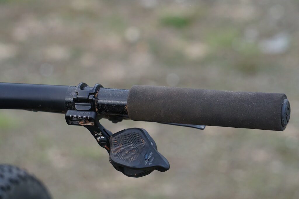 SRAM offers a few different shifters. Johnston has this paddle-shaped one for the drivetrain and a pod-style for the dropper post and any Flight Attendant controls she sets up