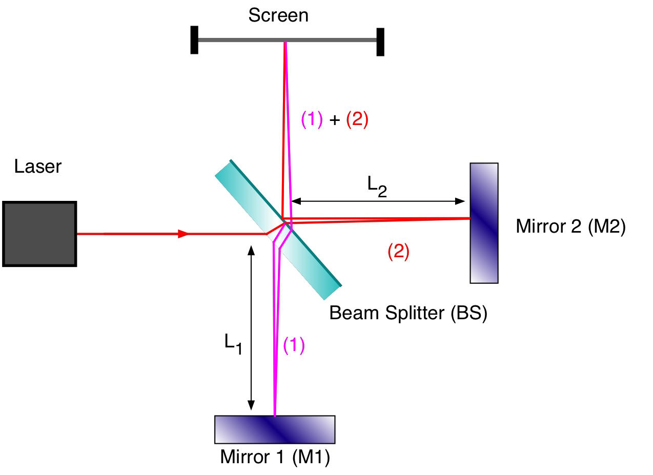 The idea behind a Michelson interferometer is that a source of light can be split into two by passing it through a device like a beam splitter, which sends half of the original light down each of two perpendicular paths. At the end of the path, a mirror bounces the light back toward the way it came from, and then those two beams are recombined, producing an interference pattern (or a null pattern, if the interference is 100% destructive) on the screen. If the speed of light is different down each path, or if the path length is different, then the interference pattern will change in response.
