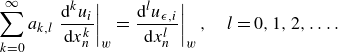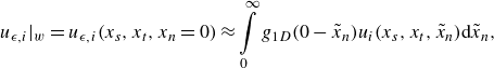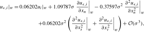 \begin{align} u_{\epsilon ,i}|_{{w}} = 0.06202 u_i|_{{w}} + 1.09787\sigma \left . \dfrac {\partial u_{\epsilon ,i}}{\partial x_{{n}}}\right |_{{w}}- 0.37597\sigma ^2 \left . \dfrac {\partial ^2 u_{\epsilon ,i}}{\partial x_{{n}}^2}\right |_{{w}} \nonumber \\+ 0.06202\sigma ^2 \left ( \left . \dfrac {\partial ^2 u_{\epsilon ,i}}{\partial x_{{s}}^2}\right |_{{w}} + \left . \dfrac {\partial ^2 u_{\epsilon ,i}}{\partial x_{{t}}^2}\right |_{{w}}\right ) + \mathcal{O}(\sigma ^{3}), \end{align}