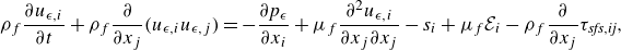 \begin{align} \rho _{{f}}\dfrac {\partial u_{\epsilon ,i}}{\partial t} + \rho _{{f}}\dfrac {\partial }{\partial x_j}(u_{\epsilon ,i}u_{\epsilon ,j}) &= -\dfrac {\partial p_{\epsilon }}{\partial x_i} +\mu _{{f}} \dfrac {\partial ^2u_{\epsilon ,i}}{\partial x_j \partial x_j} -s_i\color {black} + \mu _{{f}} \mathcal{E}_i- \rho _{{f}}\dfrac {\partial }{\partial x_j}\tau _{\textit{sfs},\textit{ij}}, \\[9pt] \nonumber \end{align}
