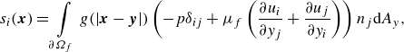 \begin{align} s_i(\boldsymbol{x}) = \int \limits _{\partial \varOmega _{{f}}}g(|\boldsymbol{x}-\boldsymbol{y}|)\left (-p \delta _{ij} + \mu _{{f}} \left (\dfrac {\partial u_i}{\partial y_j}+\dfrac {\partial u_j}{\partial y_i}\right )\right )n_j\mathrm{d}A_y, \end{align}