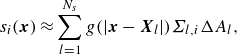 \begin{align} s_i(\boldsymbol{x}) \approx \sum _{l=1}^{N_{{s}}} g(|\boldsymbol{x}-\boldsymbol{X}_l|)\varSigma _{l,i} \Delta A_l, \end{align}