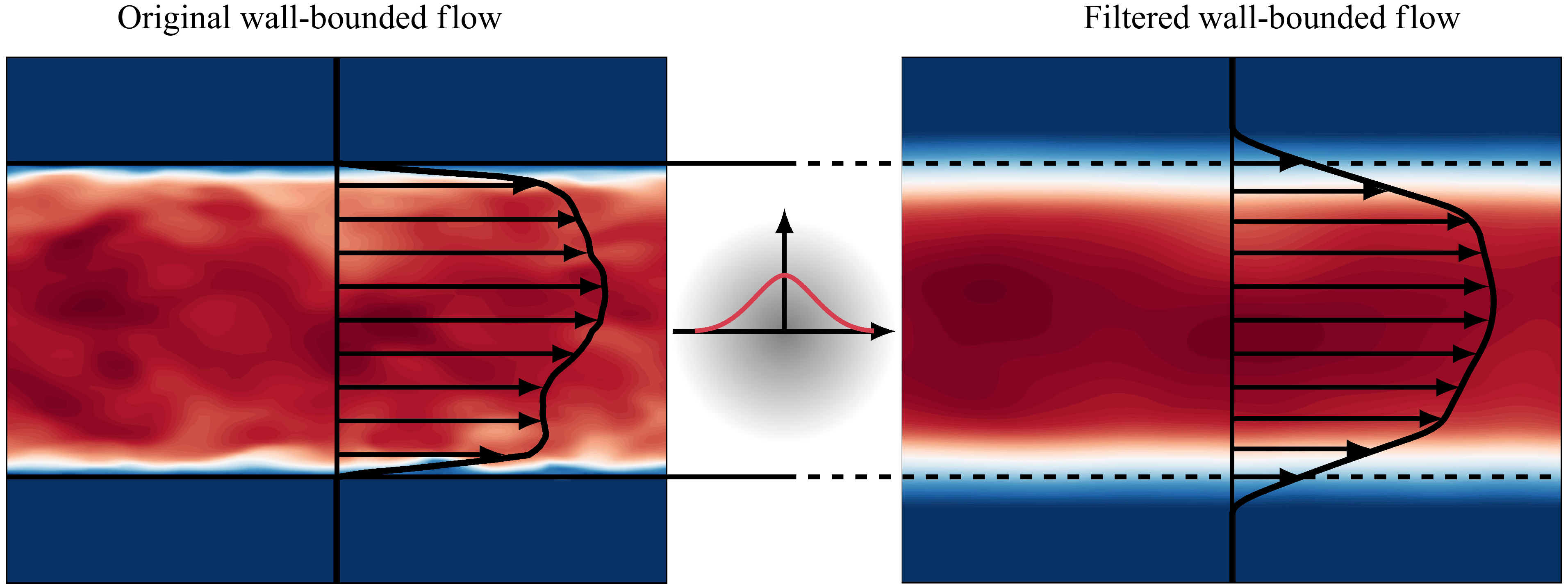 In figure 1, the effect of volume filtering on a wall-bounded flow is shown with the example of a flow between two flat plates. In the original unfiltered flow, the flow quantities are exclusively defined inside the flow domain and no-slip, no-penetration boundary conditions apply at the walls. Similarly to classical filtering in unconfined flows, volume filtering reduces the amplitudes of large wavenumbers. In addition, volume-filtered flow quantities are also defined outside the flow domain, but rapidly approach zero with increasing distance from the boundary of the flow domain. Consequently, the volume-filtered velocity at the location of the walls is not zero, but generally takes a finite value. Note that volume-filtered flow quantities that are non-zero outside the flow domain still describe a flow that is exclusively inside the flow domain, and that there is no dependency of the volume-filtered variables on unfiltered variables outside the flow domain. Volume filtering is a mathematical operation that projects the flow quantities defined inside a confined domain