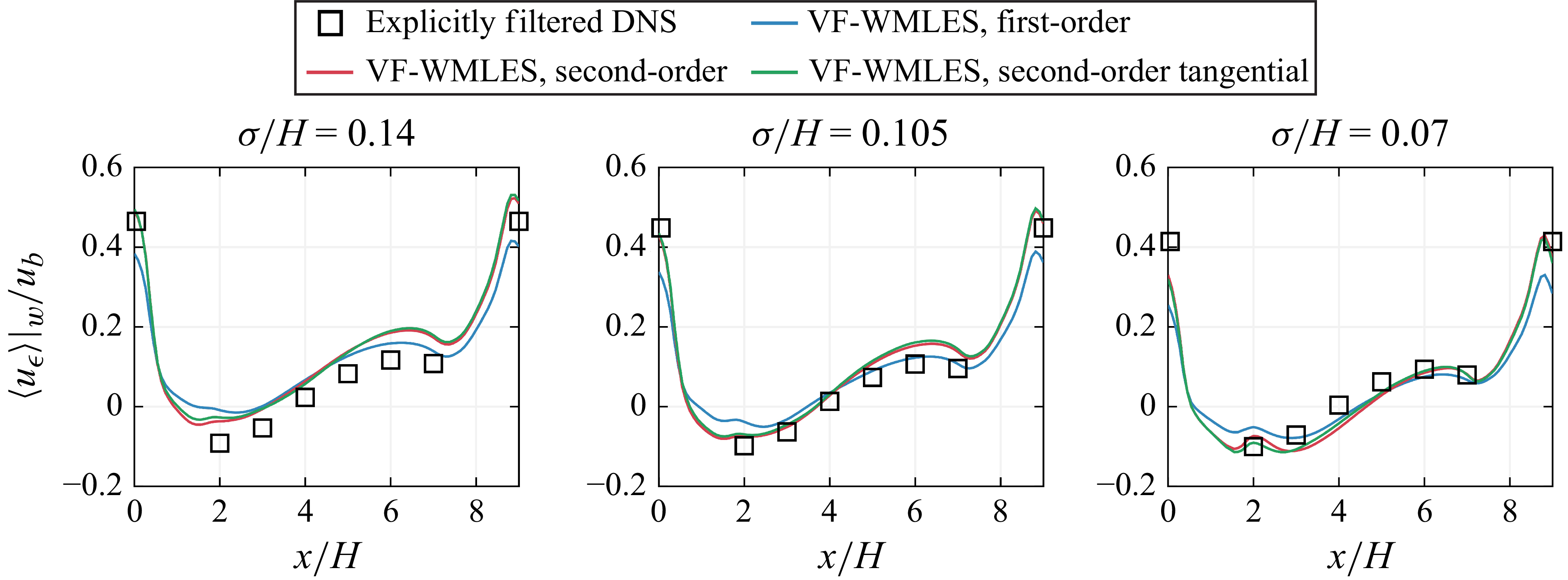 positions, are explicitly volume filtered in the wall-normal direction and are shown as a reference. As observed in figure 5, the wall-boundary condition obtained with the first-order series expansion predicts a too small volume-filtered velocity at the wall at the location of the crest of the hill (