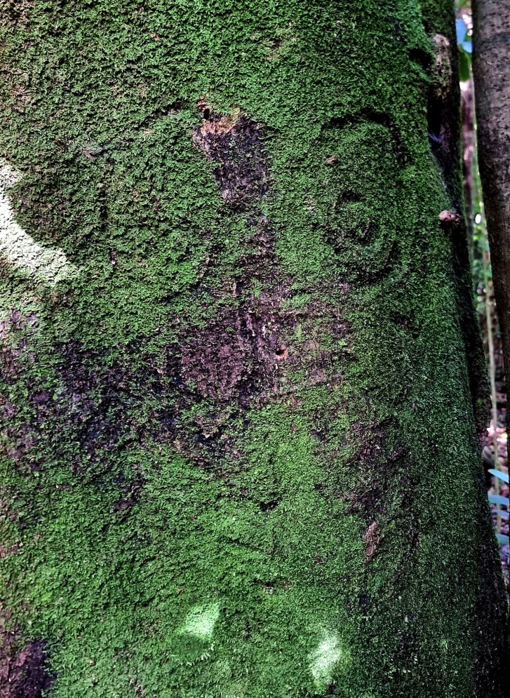 It’s a bit hard to make out, but this is a dendroglyph, markings carved into the bark of a kopi (Corynocarpus laevigatus) tree by the Moriori, who were the original inhabitants of the Chathams. They had one of the world’s only true pacifist societies, and when Maori from New Zealand invaded in 1835 they put up no resistance.  Consequently they were massacred, many of them were eaten (Maori were cannibals), and the rest enslaved.  Within a century the last full-blooded Moriori was dead, though a few people today still claim Moriori ancestry, descended from slaves and their Maori masters.  The dendroglyphs are now at least 190 years old, and very few are left.  We found this one, not signposted and not visible from the track, entirely by chance, in a patch of forest where their presence was not known, or at least not publicised:
