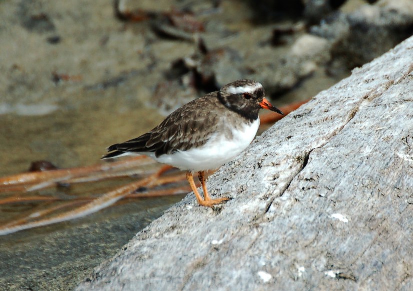 Shore plovers (Charadrius novaeseelandiae) were wiped off the New Zealand mainland by exotic mammalian predators by the 1870s, and for more than a century existed only on Rangatira Island, which lies just off Pitt Island in the Chathams. Small populations have now been re-established on a couple of predator-free islands off the New Zealand mainland, as well as another island in the Chathams group, but the global population is still below 200.  Intensive predator control on Pitt (where a few feral cats persist) has recently allowed the odd pair to breed there, which is where we saw this one, along with a recently fledged juvenile: