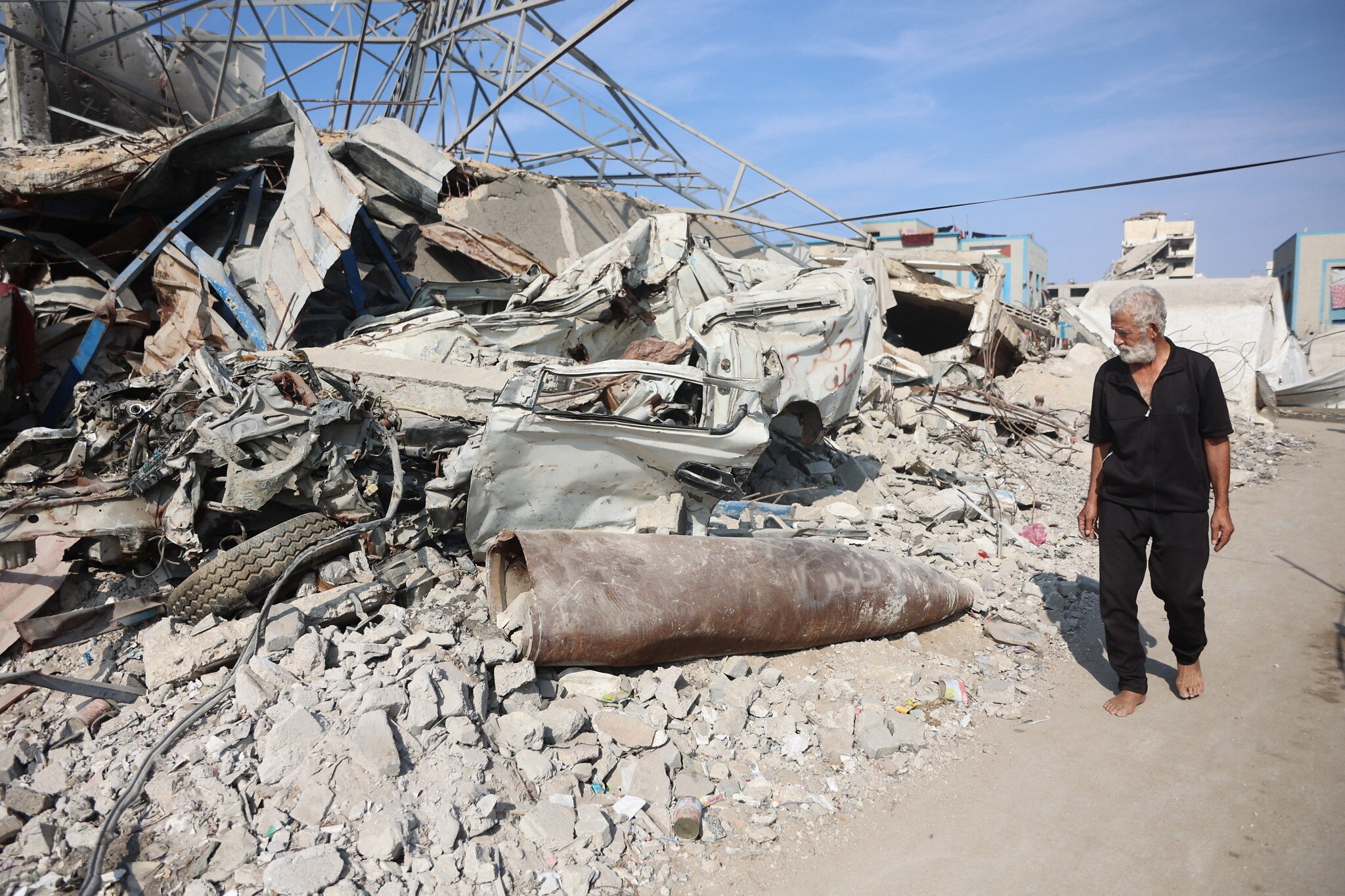 A Palestinian man walks past an unexploded missile in the Al-Rimal neighborhood of Gaza City on November 12, 2025. (Omar Al-Qattaa / AFP)