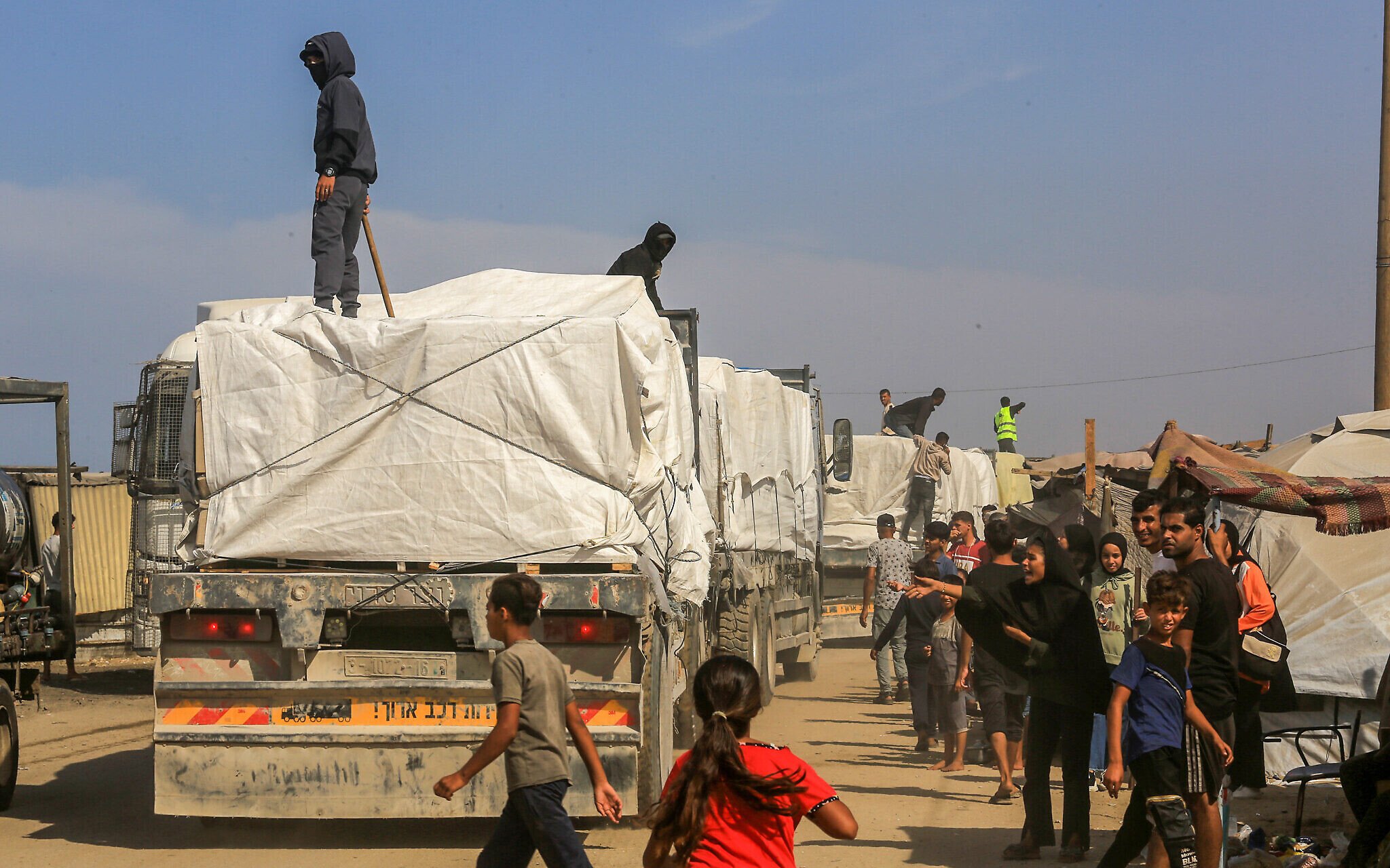 Humanitarian aid enters Gaza via the Kerem Shalom Crossing with Israel, in Khan Younis, in the southern Gaza Strip, November 2, 2025. (Abed Rahim Khatib/Flash90)