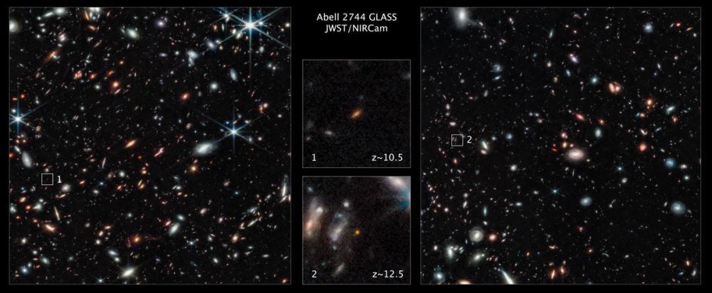 This image shows two of the galaxies the JWST found in the very early Universe. They were much brighter than thought, which suggests that they’re much more massive than researchers thought they could be. Image Credit: NASA, ESA, CSA, Tommaso Treu (UCLA); Image Processing: Zoltan Levay (STScI)
