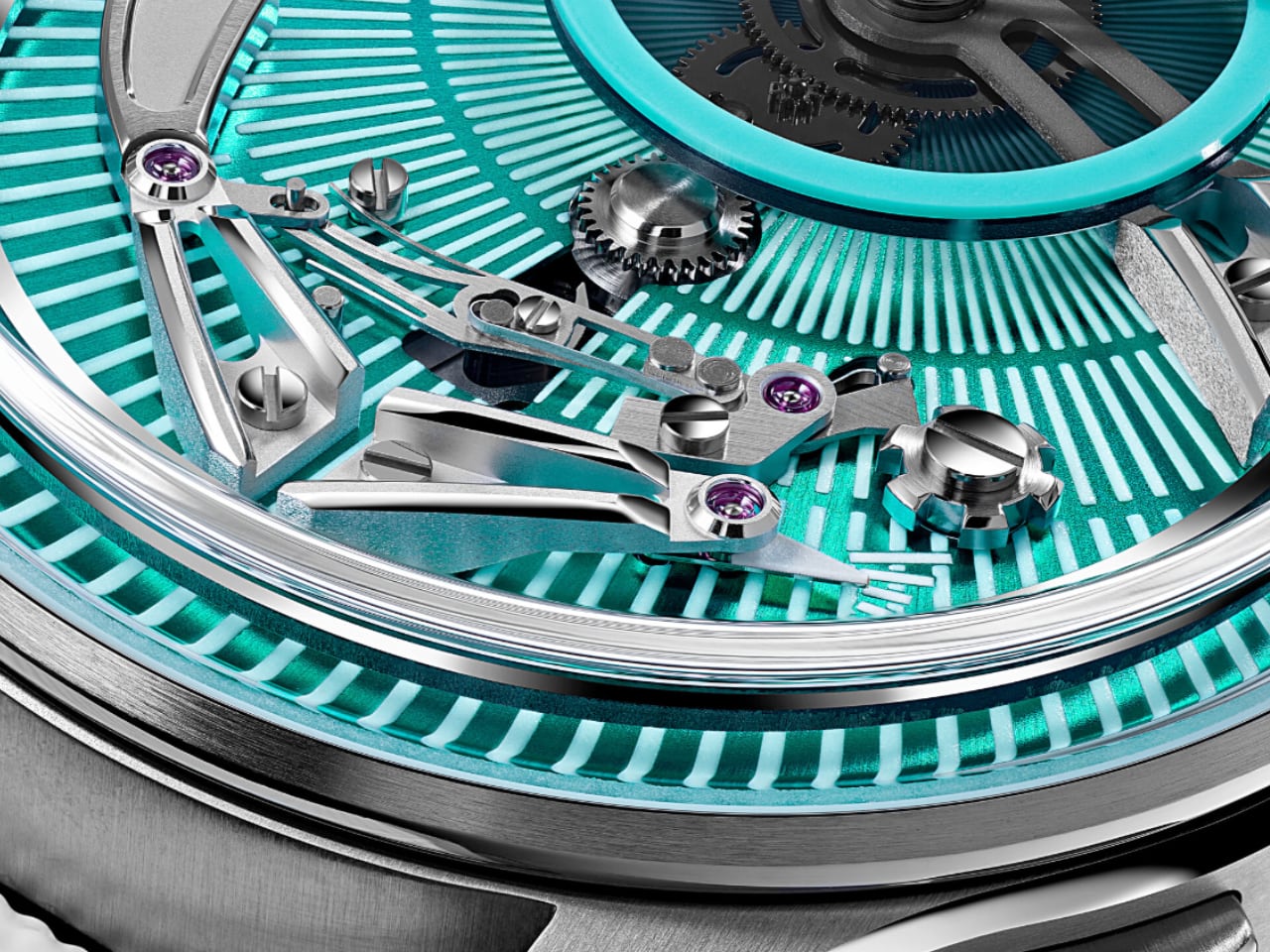 The floating Globolight X1 GL Blue ring serves as the watch’s visual anchor. The neon dial beneath creates contrast against titanium accents, and the visible striking mechanism adds mechanical intrigue. Every component works toward the same goal: making timekeeping feel less like utility and more like theater.