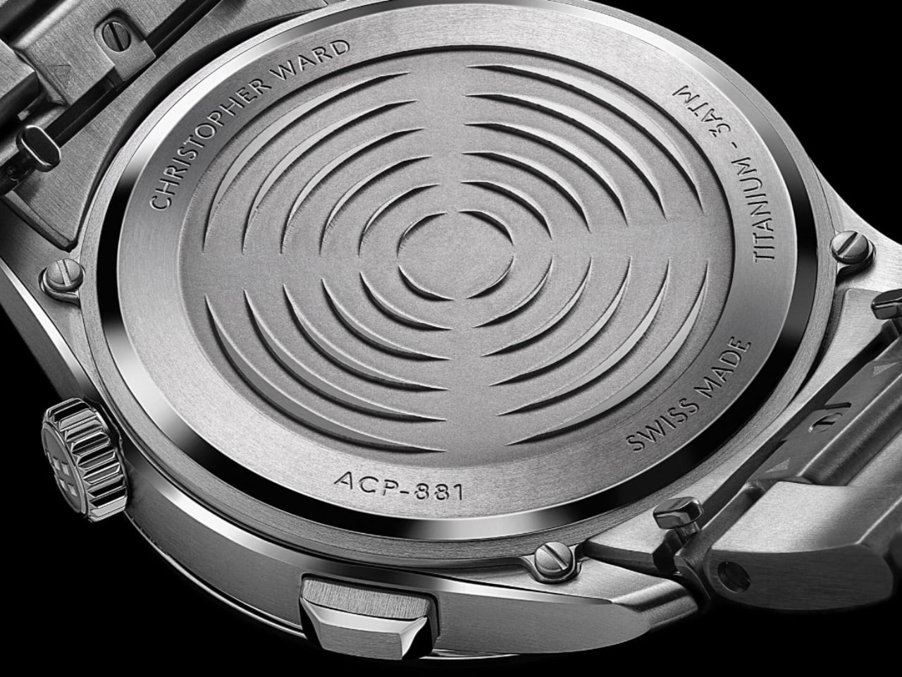 Christopher Ward applied anti-reflective coating to the domed sapphire and deep-stamped the caseback with circular patterns. The push-down crown features the brand’s twin flag motif, and the Super-LumiNova strap carries a “Clous de Paris” hobnail pattern.