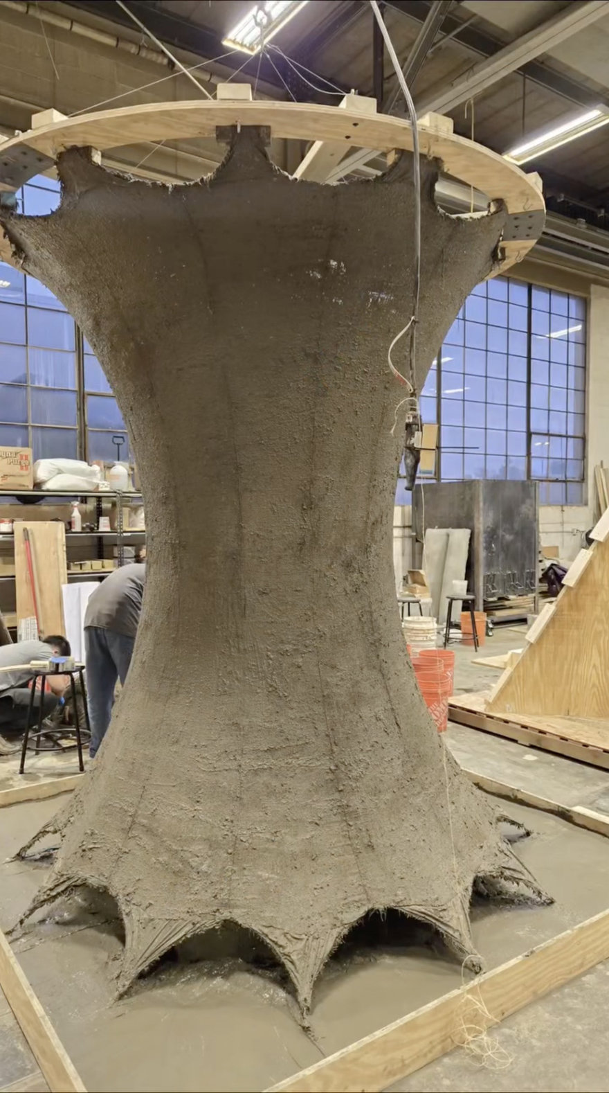 “Sometimes projects don’t go as planned, but with a little teamwork big things can happen,” writes the Fab Workshop. “The team worked together quickly to reattach the fabric form to the frame, before the concrete could set.””The final photo is it pulled back into shape!”