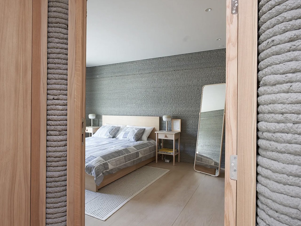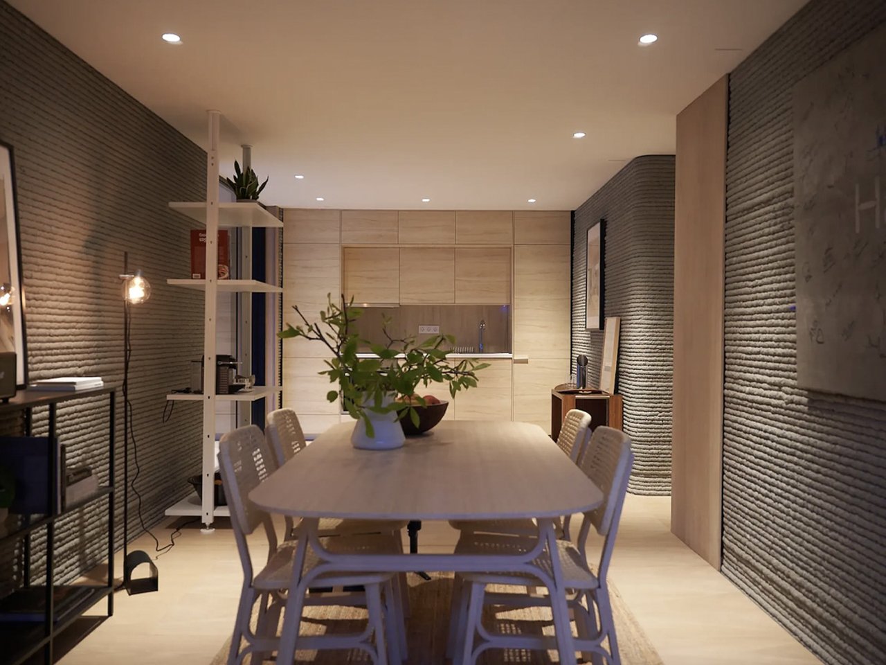 The residence features ribbed walls that reveal its 3D-printed origin, with a layout comprising a central kitchen and dining area, two bedrooms, a living room, and a bathroom. Though modest compared to luxury printed homes, it prioritizes practicality and efficiency.