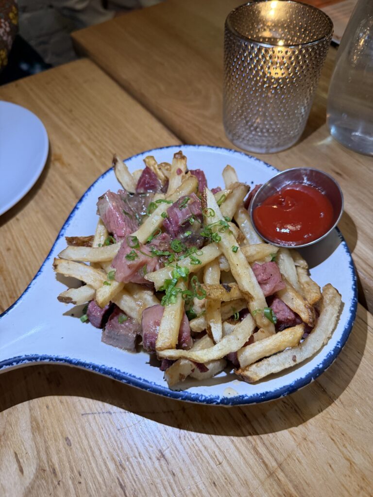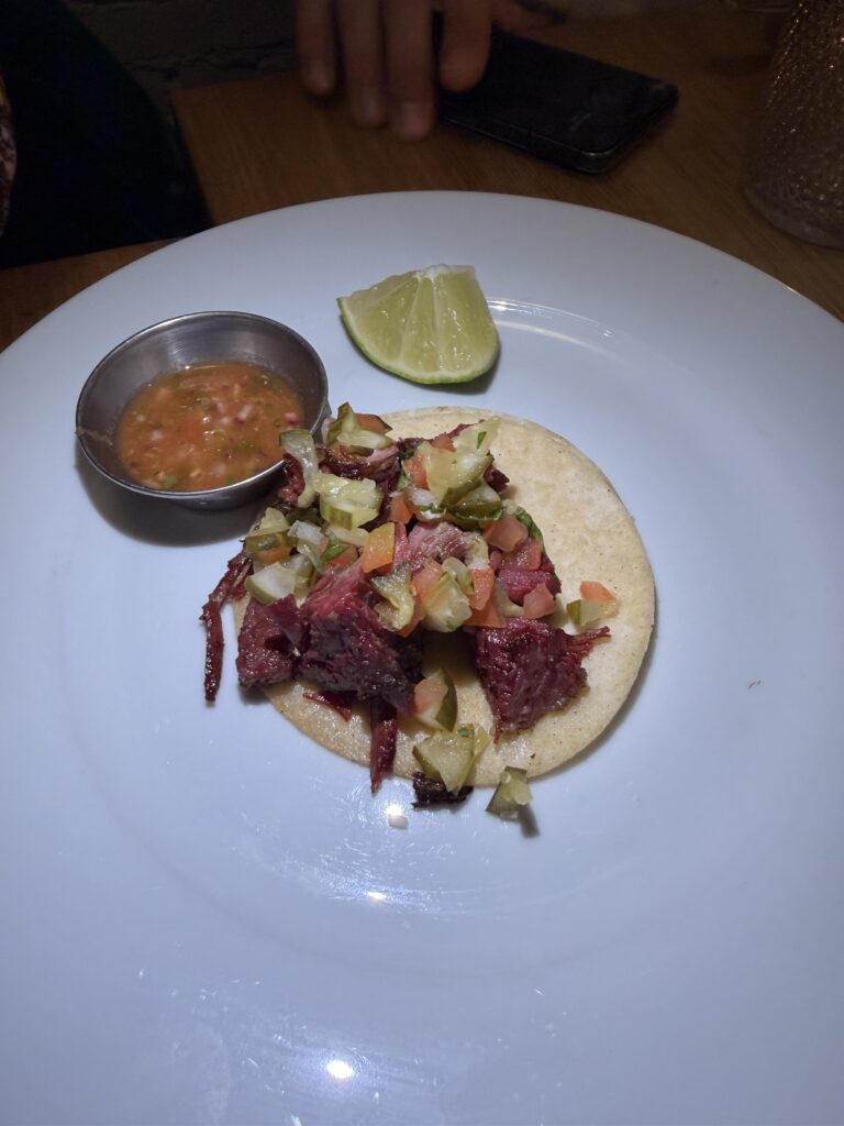 Tacos are available individually, enabling diners to sample an assortment of flavors. Options include Ribeye Carne Asada with cilantro and salsa de rabano, Thick Cut Pastrami with pico de gallo and salsa roja, and Short Rib prepared with birria sauce and pickled onion.