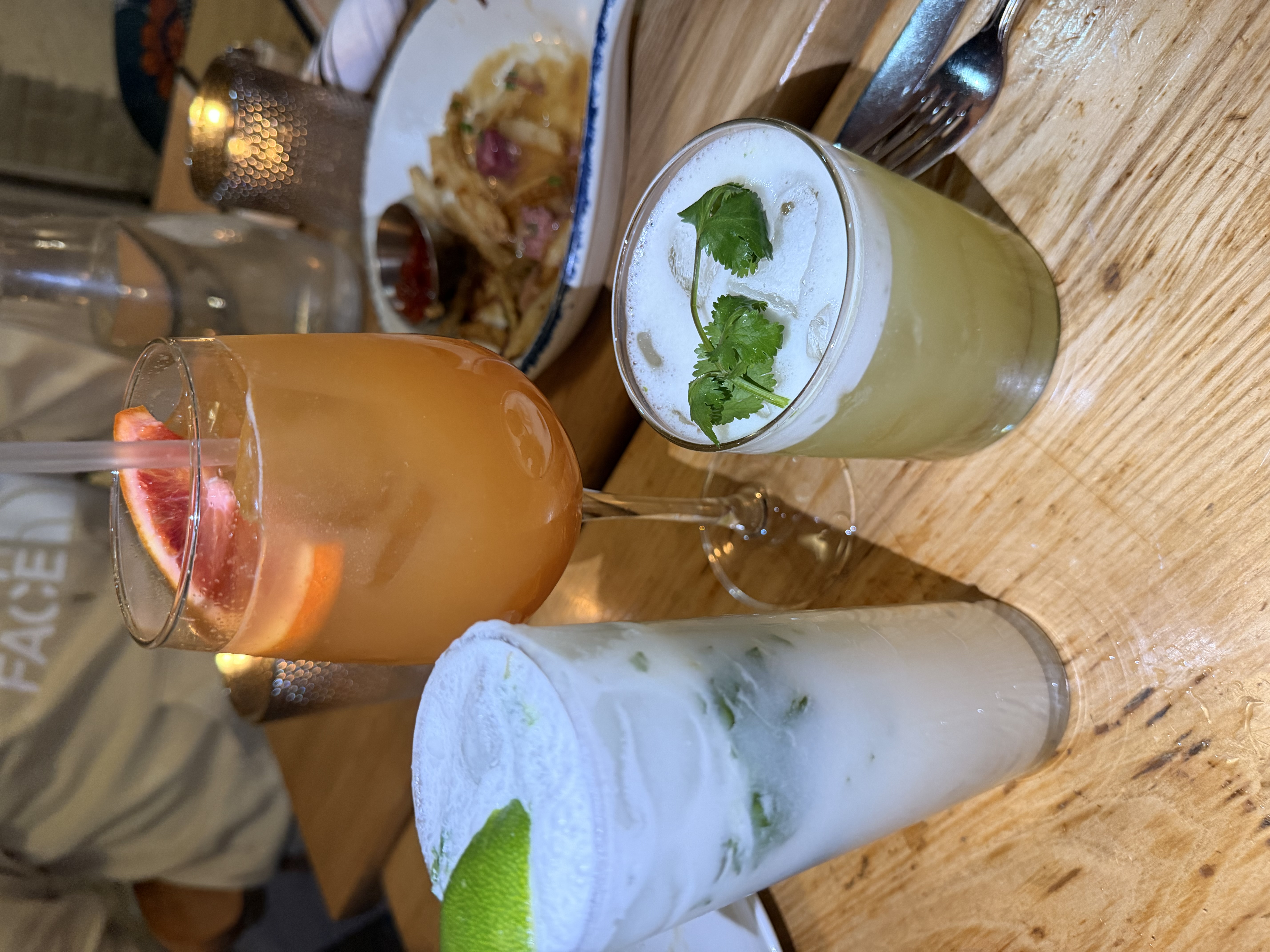 Signature cocktails are built with tequila and mezcal as base spirits. Notable drinks include the Frozen Margarita available in classic, raspberry, mango, or tamarind varieties, Tulum featuring pineapple juice and cilantro, Besos Calientes with spicy tequila and passion fruit, and Oaxacan Mule made with ginger beer and aromatic bitters. Additional options include Paloma with grapefruit soda and El Dorado with Angostura bitters. The drinks menu also includes beer offerings, wine selections from Israel, Italy, France, and Spain, and several zero-proof beverages such as tamarind, hibiscus, and mango agua fresca.