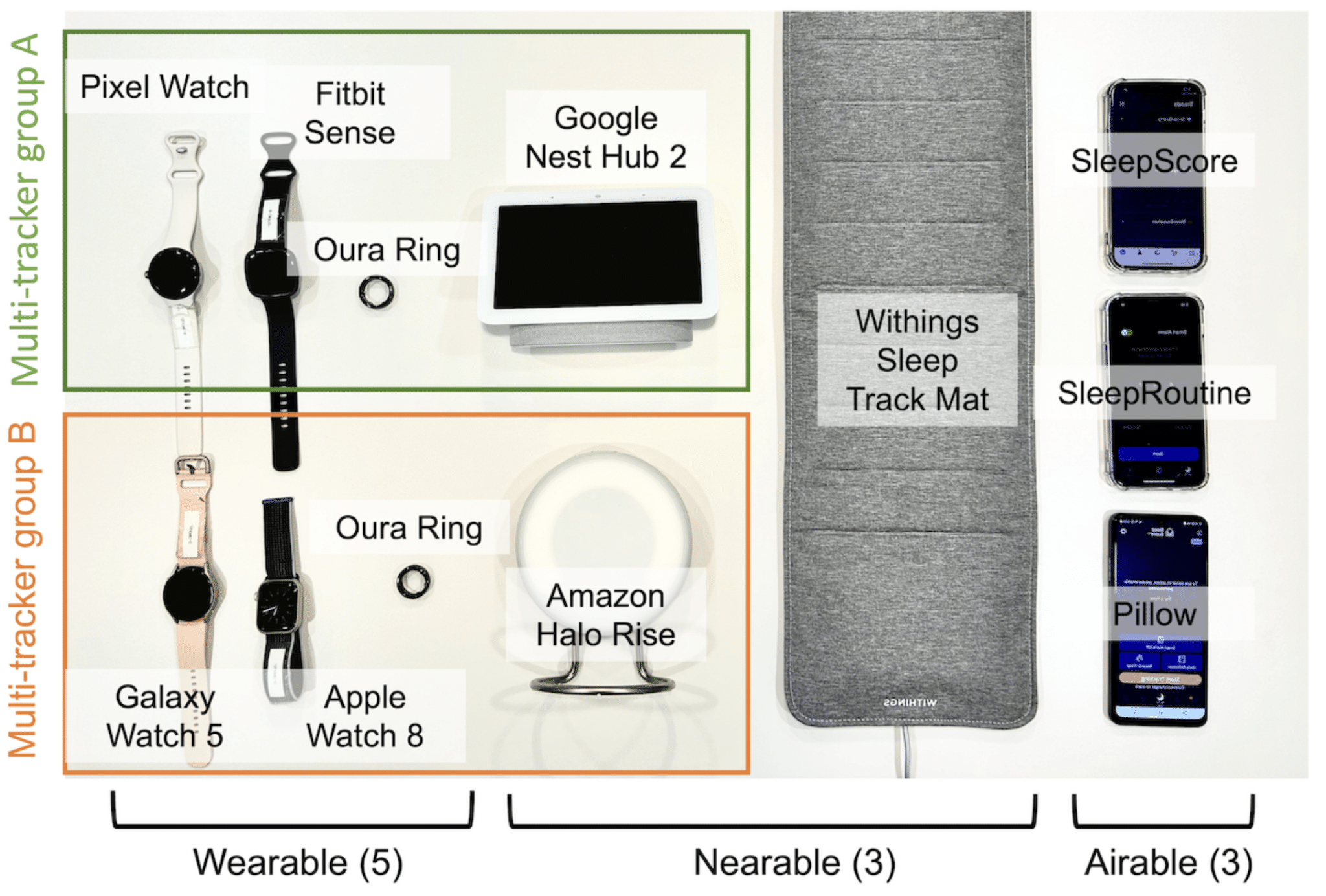 3 nearables. Amazon Halo Rise, Google Nest Hub, Withings Sleep Tracking Pad. The first two uses microphones and other tech to remotely assess your sleep. The latter uses a force-sensing pad to detect motion.