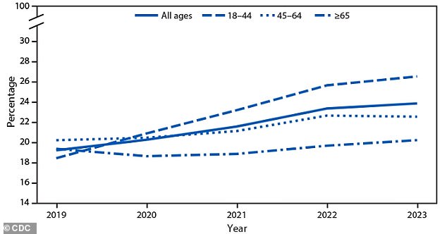 About 5 percent of American adults, or roughly 16.5 million people, experience Seasonal Affective Disorder (SAD) each year. Above, a graph showing the growth of mental health treatments among adults by age group in the US from 2019 to 2023