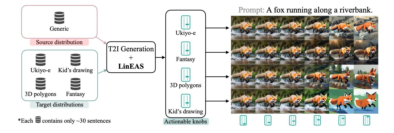 Figure 3: LinEAS learns lightweight maps to steer pretrained model activations. With LinEAS, we gain fine-grained control on text-to-image generation to induce precise styles (in the figure) or remove objects. The same procedure also allows controlling LLMs.