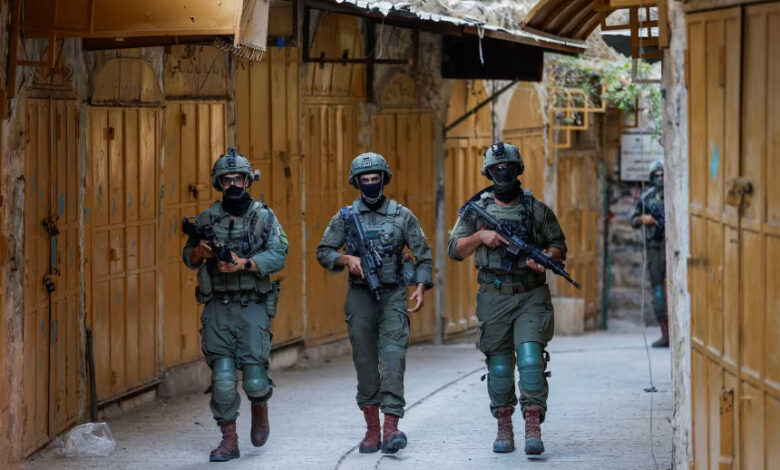 Israeli troops walk during a weekly settlers’ tour in Hebron, in the Israeli-occupied West Bank, August 23.