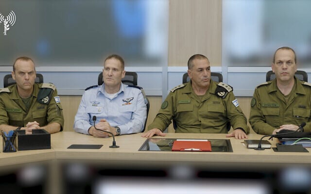 L-R: Intelligence Directorate chief Maj. Gen. Shlomi Binder, IAF chief Maj. Gen. Tomer Bar, IDF Chief of Staff Lt. Gen. Eyal Zamir, and Operations Directorate chief Maj. Gen. Oded Basiuk, during an assessment on June 13, 2025. (Israel Defense Forces)