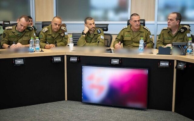 L-R: Intelligence Directorate chief Maj. Gen. Shlomi Binder, Deputy Chief of Staff Maj. Gen. Tamir Yadai, Assistant to the Chief of Staff Col. Alon Laniado, IDF Chief of Staff Lt. Gen. Eyal Zamir, and Operations Directorate chief Maj. Gen. Oded Basiuk, during an assessment at the IDF’s underground command center, June 24, 2025. (Israel Defense Forces)