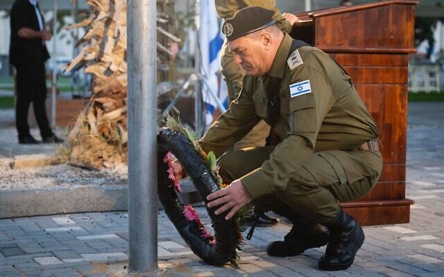 IDF Chief of Staff Lt. Gen. Eyal Zamir lays a wreath during a ceremony at the Nahal Oz base, marking the Hebrew anniversary of the October 7 onslaught, October 16, 2025. (Israel Defense Forces)