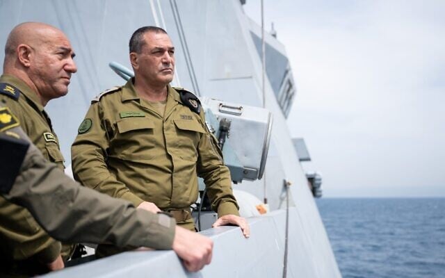 IDF Chief of Staff Lt. Gen. Eyal Zamir (right) is seen alongside Navy Chief Vice Adm. David Sa’ar Salama on an Israeli Navy corvette at the Haifa naval base, March 25, 2025. (Israel Defense Forces)