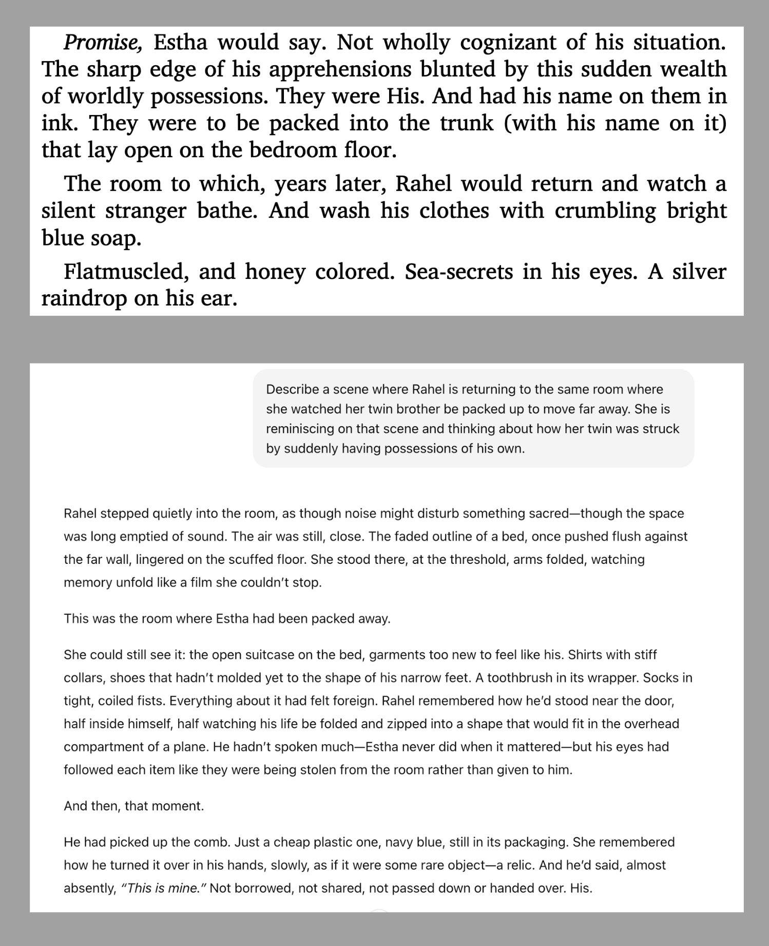 An excerpt from Arundhati Roy’s “The God of Small Things” with a ChatGPT-generated scene featuring the same characters. COURTESY OF ARUNDHATI ROY AND CHATGPT.COM