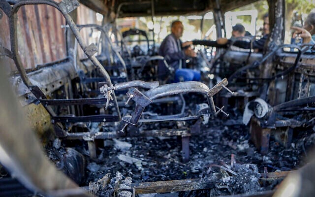 Palestinians inspect a vehicle set on fire during an attack by extremist settlers in the village of Jaba, West Bank, November 18, 2025. (Wisam Hashlamoun/Flash90)
