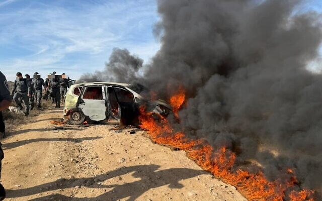 A vehicle burns amid riots by settlers during the evacuation and demolition of the illegal Tzur Misgavi outpost in the West Bank, November 17, 2025. (Israel Police)