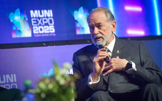 US Ambassador to Israel Mike Huckabee speaks at the Muni Expo 2025 conference in Tel Aviv, on July 15, 2025. (Avshalom Sassoni/Flash90)