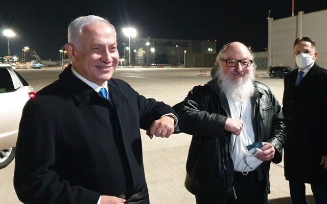 Prime Minister Benjamin Netanyahu (L) greets convicted US spy Jonathan Pollard at Ben Gurion Airport, December 30, 2020. (Courtesy)