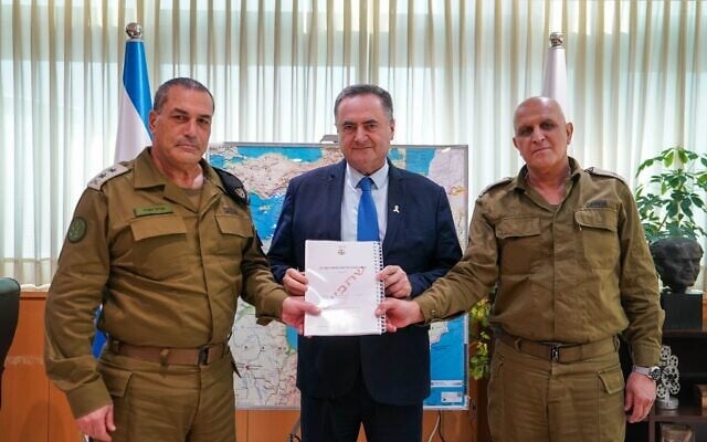 IDF Chief of Staff Lt. Gen. Eyal Zamir (left) and Maj. Gen. (res.) Sami Turgeman (right) present Defense Minister Israel Katz (center) with the findings made by a panel of former senior officers tasked with evaluating the military’s probes into the October 7 attack, on November 9, 2025. (Ariel Hermoni/Defense Ministry)