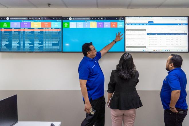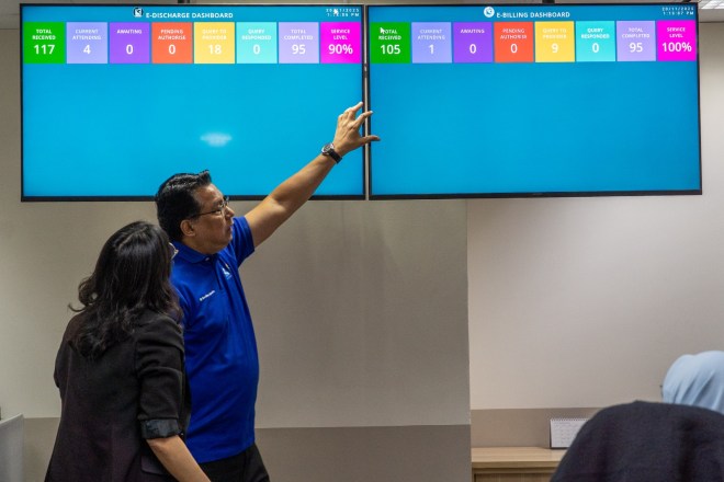 These dashboards at PMCare’s call centre provide real-time monitoring of final guarantee letter issuance, tracking claims submitted via both Medibase portals and API e-billing. Photo by Saw Siow Feng for CodeBlue.