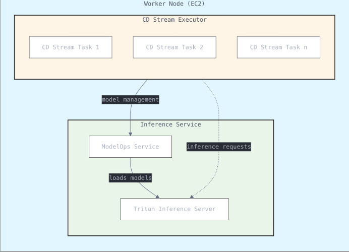 The first optimization we applied was to centralize the model inference executions using a model inference server solution. Instead of each process maintaining its own copy of CDNet, each CPU worker instance would be initialized with a single (containerized) copy of CDNet managed by an inference server, serving the change detection processes running on the instance. We chose to use Triton Inference Server as our inference server because it is open source, straightforward to deploy, and includes support for multiple runtime environments and AI/ML frameworks.
