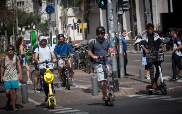 Israelis ride their electric scooters on Rothschild Boulevard in Tel Aviv, on May 5, 2021. (Miriam Alster/Flash 90)