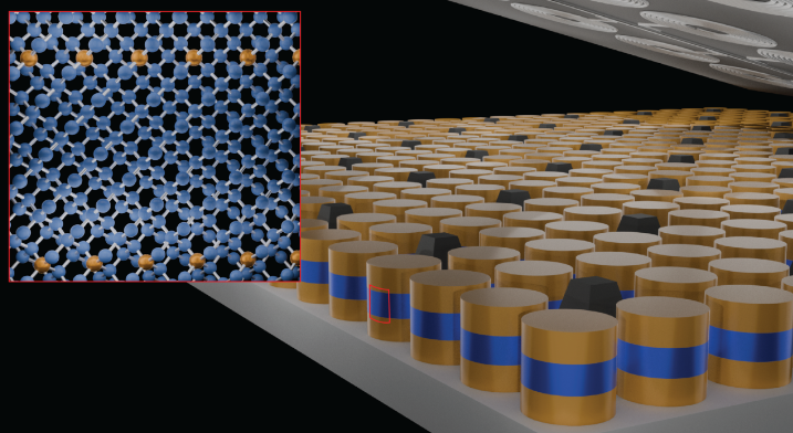 Josephson junction structures — quantum devices made of two superconductors and a thin non-superconducting barrier — using different forms of germanium (Ge): super-Ge (in gold), semiconducting Ge (in blue), and super-Ge on wafer-level scale. Millions of Josephson junction pixels (10 micrometer square) can be created with this new material stack on wafer scale. Inset shows crystalline form of Super-Ge on the same matrix of semiconductor Ge, a key for crystalline Josephson junction. Image by Patrick Strohbeen/NYU