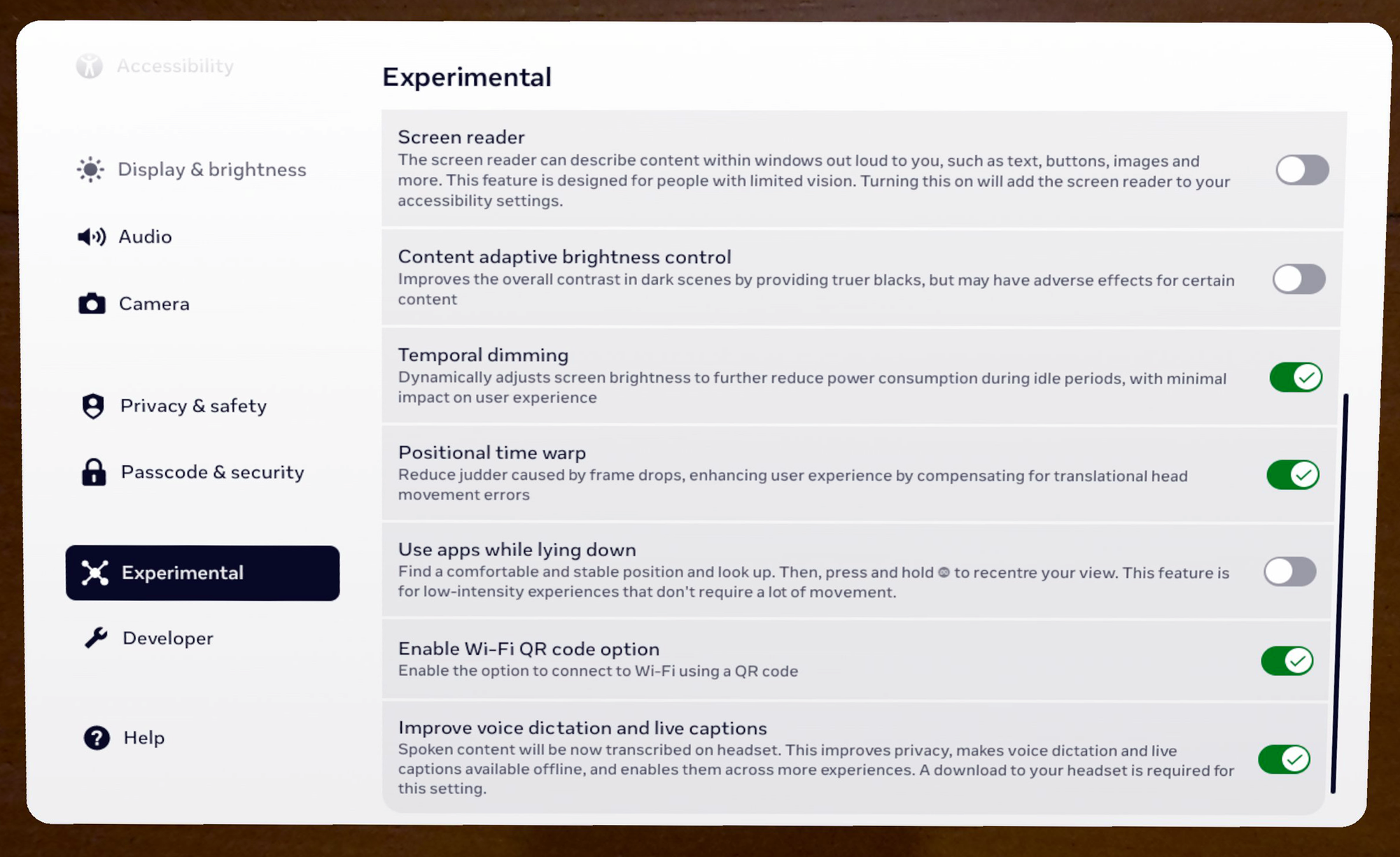With Horizon OS v83, Meta has added an experimental setting called System Positional TimeWarp (SysPTW). When enabled, it applies to all apps at all times, extending the system-level reprojection to be positional, not just rotational.