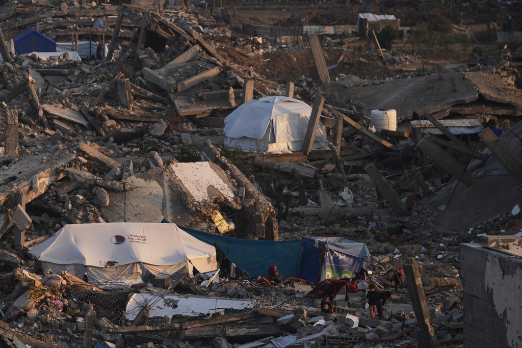 Tents sheltering displaced Palestinians stand amid the destruction left by the Israeli air and ground offensive in Gaza City on Nov 28, 2025. (PHOTO / AP)
