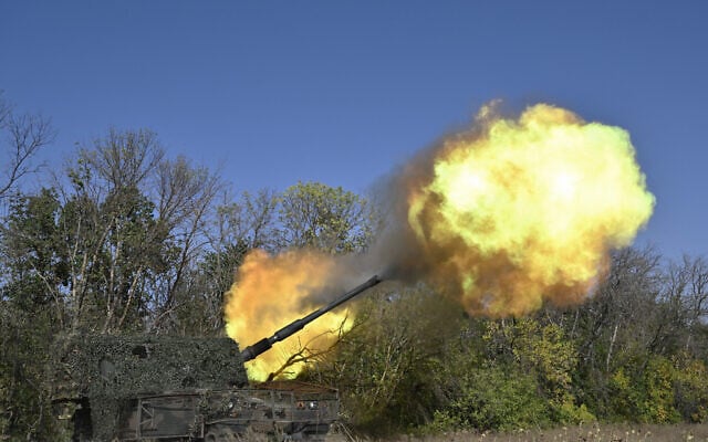 Ukrainian servicemen of the 26th artillery brigade fire an AHS Krab self-propelled howitzer toward Russian positions near the front line in the Chasiv Yar area in the Donetsk region on September 30, 2024, amid the Russian invasion of Ukraine. (Genya SAVILOV / AFP)