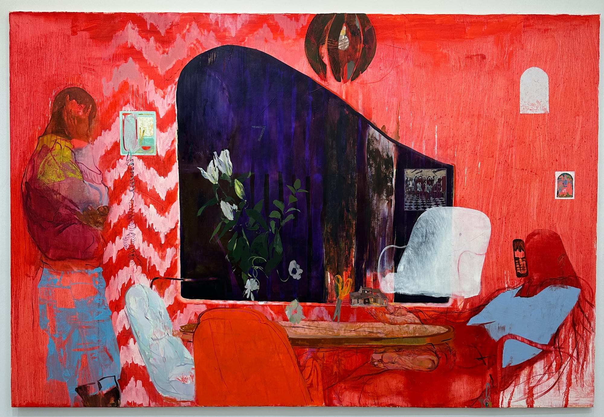 In the 21 works on view (all 2025), Packer approaches these questions with virtuous skill and a deep knowledge of the history of her medium. Take “A.D.I.P.T.A. after Jay Electronica”: at 8 by 12 feet, it is monumental, but Packer manages to imbue the scene with a sense of intimacy. Red is the overwhelming color, from the walls to the furniture to the two figures, one standing on the left, the other seated on the right, who seem to be caught in the “impossible communication” that Freely referred to in her 2014 poem “But Is It an Essay, Voyager Edition”: “This is an impossible communication, but that’s the only kind we want.” The standing figure holds her hand to her ear, as if speaking on a telephone, even though the wall-mounted phone next to her remains unused. The seated figure has a telephone receiver stuck to the side of her head, no hand holding it in place. And then there’s the title of the work, referring as it does to a tender song by the American rapper Jay Electronica, and suggesting that the frustrated desire to connect with others structures our relationships both in life and in death: “I got numbers in my phone that’ll never ring again/ ’Cause Allah done called them home, so until we sing again.”