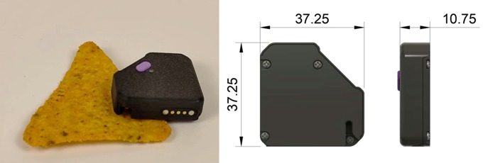 Weighing in at 85 grams, the trackers are also impressively compact: a Dorito for scale.